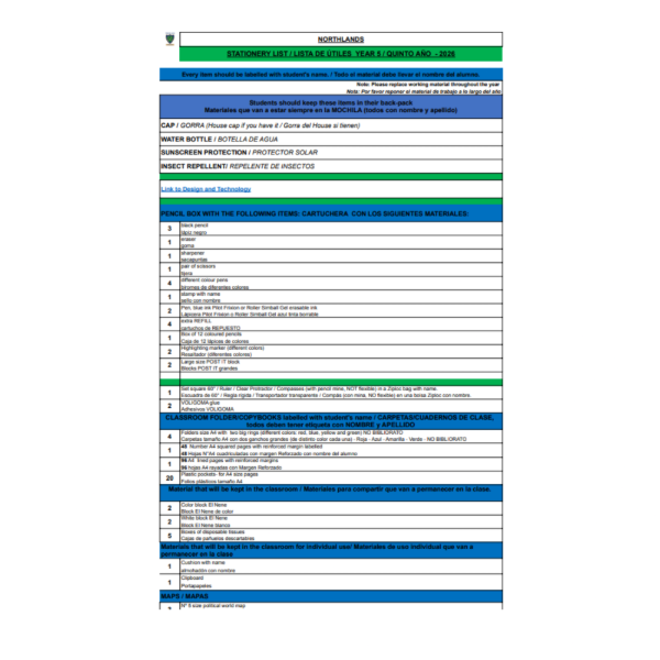Caja Escolar - Colegio Northlands - QUINTO AÑO